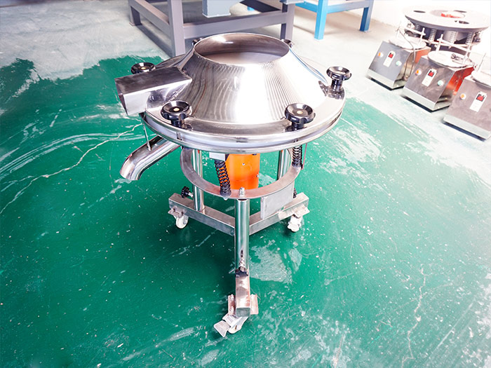450過濾篩——直徑為450mm,由電機驅(qū)動重錘激振,篩體產(chǎn)生水平、垂直、傾斜的三次元運動,使含水物料在篩網(wǎng)上被拋起并由中央向外旋轉(zhuǎn)擴散到出料口排出,含水物料在篩網(wǎng)上面的運動中,細小顆粒或液體透過篩網(wǎng),通過選擇安裝相應的篩網(wǎng)和篩網(wǎng)層數(shù)使物料完成篩選分級或過濾,分選出的物料由各自的出料口分別自動排出。是一臺單層篩分和過濾使用的振動篩,被各個廠家和用戶叫做液體專用振動篩,因為機身小的原因,所以它的處理量不多,適用于小產(chǎn)能要求。