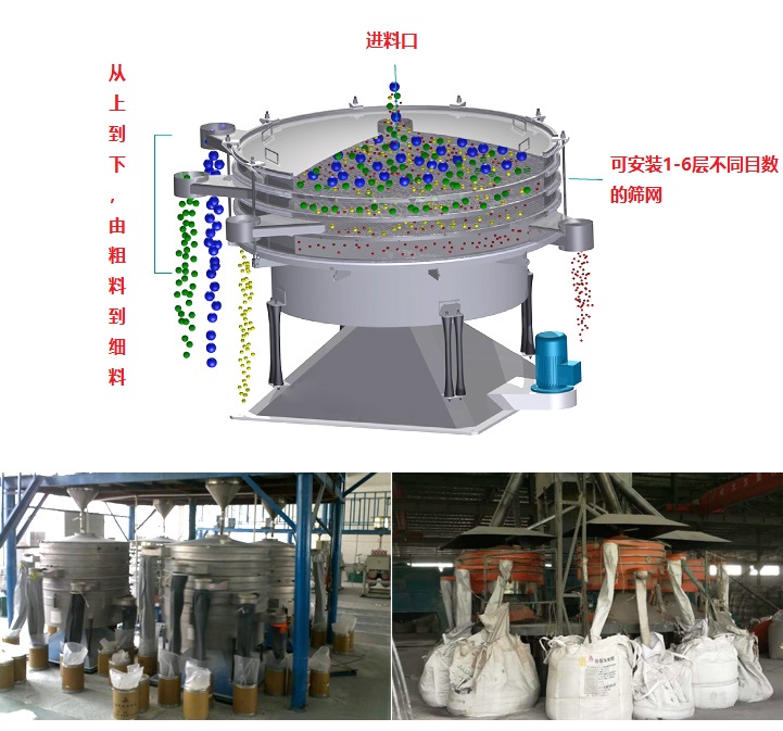 圓形搖擺篩采用仿人工篩分原理,用于準確分離1-6級粉粒,通常用于干燥、粉狀、顆粒狀產品的篩分、分級和除塵,特別適用于細、脆、輕等難于篩分的產品。