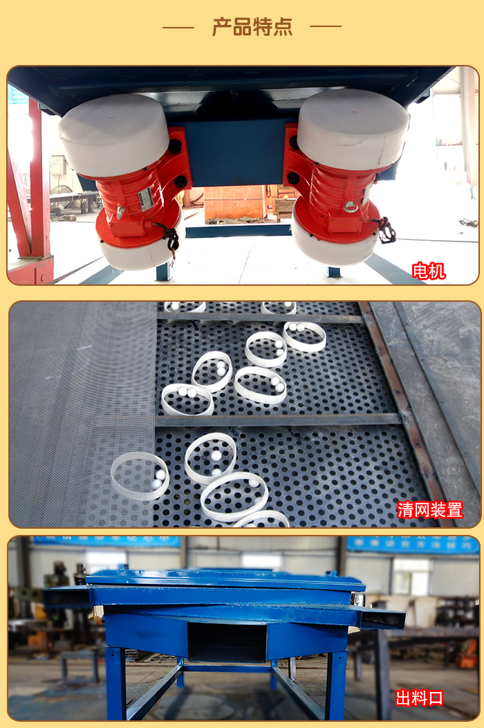 適用于粒度在0.074—5mm,含水量小于7%,無(wú)粘性的各種干式粉狀或顆粒狀物料的篩分